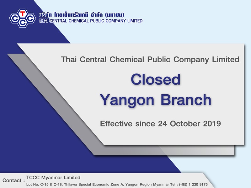Thai Central Chemical Public Company Limited would like to inform that the company has closed Thai Central Chemical Public Company Limited, Yangon, effective since 24 October 2019.